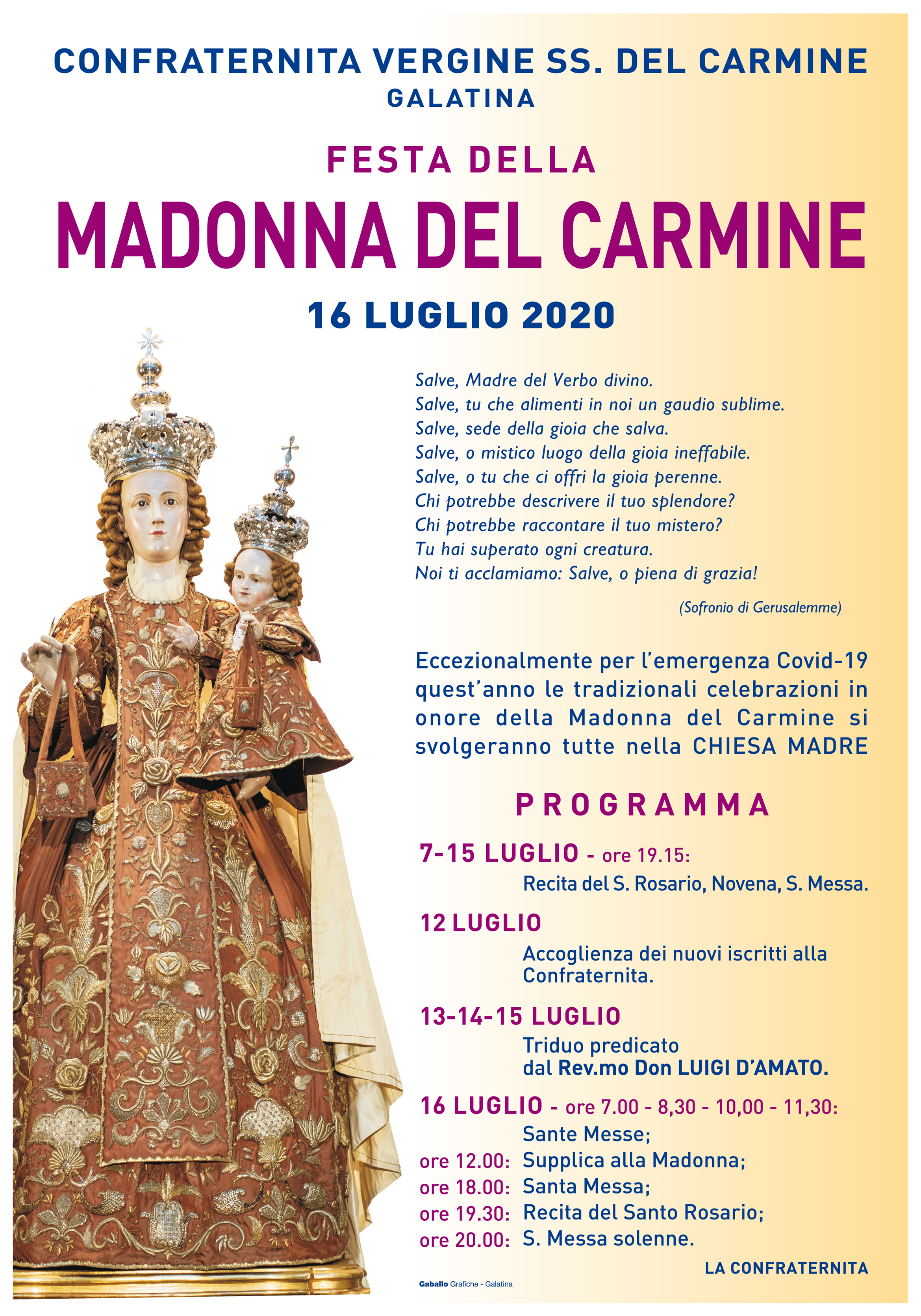 «Bussate e vi sarà aperto…» dice il Signore. E noi abbiamo bussato alla porta della Chiesa Madre, abbiamo chiesto la disponibilità ad accoglierci al suo Parroco, che, senza indugio, ha accettato la nostra richiesta. La festa della Madonna del Carmine, in via del tutto eccezionale, si farà nella Chiesa Madre. I suoi grandi spazi consentiranno l’afflusso dei fedeli nel rispetto delle distanze stabilite.